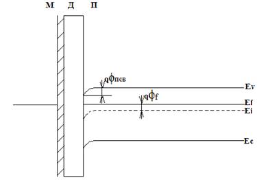 Дополнительное искривление зон и накопление отрицательного заряда подвижных электронов у поверхности возникает за счет разности работ выхода для диэлектрика и полупроводника. Чаще всего в качестве диэлектрика используется двуокись кремния SiO2 . Работа выхода из SiO2 меньше, чем из кремния, поэтому между диэлектриком и полупроводником возникает контактная разность потенциалов ϕМДП , величина которой составляет приблизительно 0,4 В.