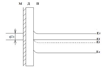 При подаче отрицательного напряжения на затвор, возникающее электрическое поле уменьшает поле, созданное контактной разностью потенциалов и обусловленное Qпов и приводит к уменьшению заряда подвижных электронов у поверхности. Под действием электрического поля электроны перемещаются вглубь полупроводника. С увеличением отрицательного напряжения на затворе заряд подвижных электронов у поверхности уменьшается и поверхностный слой полупроводника стремится изменить свой тип проводимости с электронного на дырочный. При некотором напряжении на затворе поверхностный слой имеет собственную проводимость. В этом случае уровень Ферми совпадает с серединой запрещенной зоны EF =Ei (рисунок 3).