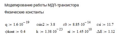 Для начала построения модели нужно ввести все необходимые исходные данные. Введем сначала физические константы, которые понадобятся нам для дальнейших расчетов. Такими константами являются: заряд электрона, диэлектрическая проницаемость оксида кремния, вакуума и кремния, контактная разность потенциалов между оксидом кремния и кремнием, постоянная Больцмана, концентрация собственных носителей в кремнии, ширина запрещенной зоны кремния. Все эти величины введены в изложенном выше порядке. Часть листинга, соответствующая вводу констант приведена на рисунке 6.