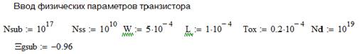 Далее нужно ввести физические параметры самого транзистора. К таковым относятся: концентрация легирующей примеси в подложке Nsub, плотность поверхностных состояний Nss, концентрация примеси в области стока Nd, длина канала W, толщина подзатворного окисла Tox, разность работ выхода из затвора и подложки Ξgsub. Листинг представлен на рисунке 7.