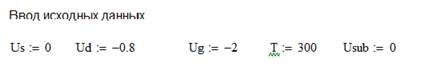 Теперь нужно ввести исходные данные для построения модели. Напряжение на затворе Ug , напряжение на стоке и истоке Ud и Us , напряжение на подложке Usub , температура окружающей среды Т.