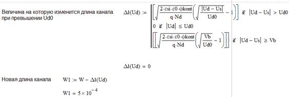 После расчета напряжений перекрытия канала и пробоя p-n-перехода нужно вычислить величину, на которую уменьшится длина индуцированного канала при превышении напряжением на стоке напряжения перекрытия канала. Листинг расчета представлен на рисунке 11.