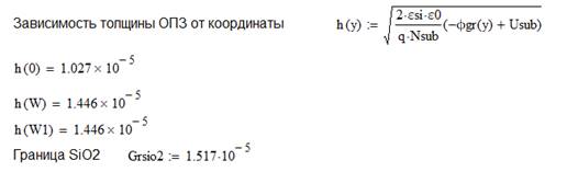 В приведенном листинге h(0) – толщина ОПЗ около истока, h(W) и h(W1) – толщина ОПЗ около стока. h(W) – толщина ОПЗ около стока до перекрытия канала, h(W1) – после перекрытия канала. Граница SiO2 – это граница раздела полпроводника и оксида кремния. Найти границу SiO2 можно, посчитав толщину ОПЗ при напряжении на стоке равном граничному напряжению перекрытия канала. При этом h(W) и будет границей SiO2 .