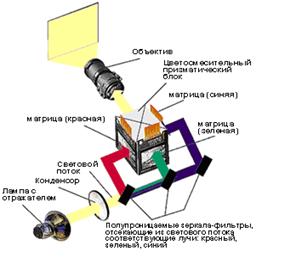 Современные LCD-проекторы выполняются на базе трех жидкокристаллических матриц. Структурная схема такого проектора представлена на рисунке 1.1. Световое излучение лампы с помощью конденсатора преобразуется в равномерный световой поток, из которого дихроичные зеркала-фильтры выделяют три цветовые составляющие (красную, синюю и зеленую) и направляют их на соответствующие LCD-матрицы (дихроичное зеркало отражает одну цветовую составляющую светового потока и пропускает лучи двух других). Сформированные ими цветные изображения объединяются в призматическом блоке в одно полноцветное, которое затем через объектив проецируется на внешний экран.