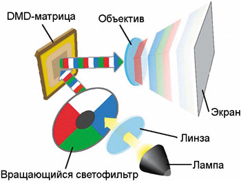 В зависимости от угла поворота фильтра (а, следовательно, и цвета падающего светового потока) DMD-кристалл формирует на экране синюю, красную или зеленую картинки, которые последовательно сменяют одна другую за короткий интервал времени. Усредняя отражаемый экраном световой поток, человеческий глаз воспринимает изображение как полноцветное.