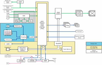 Из сигнала на выходе УПЧ с помощью интегрированного полосового фильтра выделяется сигнал 1-ой ПЧЗ и поступает на вход мультистан-дартного демодулятора звукового сигнала. С его выхода звуковой сигнал поступает на переключатель звуковых сигналов (в составе IC802). На другие входы переключателя (выв. 113 - 118 IC802) подаются звуковые сигналы с разъемов НЧ входа. С выхода переключателя выбранный пользователем звуковой сигнал поступает на звуковой процессор (в составе микросхемы IC802), а с его выхода (выв. 123, 124) - на вход усилителя звуковой частоты (УМЗЧ) IC600 (выв. 7 и 14) и на вход усилителя наушников IC601 (выв. 2,3).