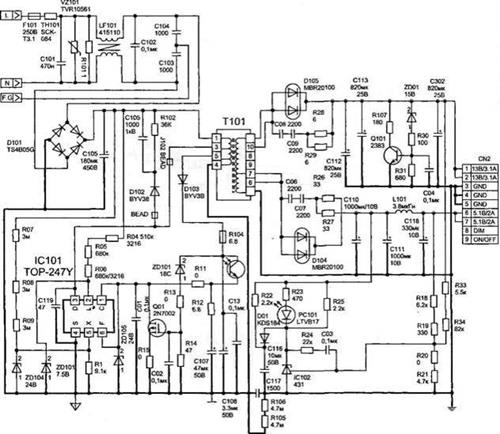 IC101 типа TOP- 247Yфирмы PowerIntegration. Отличие схем лишь в номиналах некоторых элементов и в назначении контактов выходного разъема CN2. Микросхема включена по стандартной схеме с управлением по току. Выбрана рабочая частота микросхемы 66 кГц (вывод F подключен к выводу контроля С). Вход обратной связи по напряжению L используется для запуска преобразователя. Поэтому же входу контролируется входное напряжение преобразователя на пороговые значения. Вход контроля предельного тока через силовой ключ, управления (ON/OFF) и синхронизации - вывод X. Предельный ток через силовой ключ определяется номиналом резисторов делителя R1 R07 R08 R09. Вывод С - вход усилителя ошибки и обратной связи по току. Напряжение ошибки определяется напряжением с обмотки 1-2 импульсного трансформатора Т101 и проводимостью фототранзистора оптрона РС101. Оптрон РС101 входит в состав цепи обратной связи схемы стабилизации выходных напряжений блока. Для контроля выходных напряжений используется узел на элементах IC103 и РС101, подключенный к вторичному напряжению 13 В. Ток через фотодиод оптрона зависит от уровня напряжения 13 В, что приводит к изменению проводимости фототранзистора оптрона и изменению напряжения на входе усилителя ошибки - выводу С микросхемы IC101. Узел на элементах ZD101 и Q01 является дополнительной (кроме встроенных в микросхему цепей защиты) защитой блока питания от превышения номинала входного напряжения преобразователя. Аналогичную функцию выполняет узел на элементах Q101, ZD01 во вторичной цепи. Он контролирует напряжение 13 В и, при его резком увеличении (более 15 В), транзистор Q101 шунтирует выход выпрямителя D106 С11, С112, что приводит к срабатыванию токовой защиты в микросхеме IC101 и переходу блока питания в режим защиты. Из напряжений 13 и 5 В блока питания с помощью интегральных стабилизаторов формируются напряжения 33, 9, 8, 5, 3,3 и