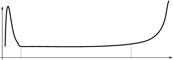 Типичный характер изменения интенсивности отказов l(t) изделий от начала эксплуатации до списания представлен следующим графиком: