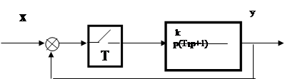 Пример 10. Определить условия устойчивости и величину критического коэффициента усиления по критерию Найквиста дискретной системы, схема которой приведена на рис. 6.