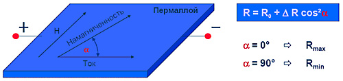 Принцип работы магниторезистивных датчиков основан на изменении направления намагниченности внутренних доменов слоя пермаллоя (NiFe) под воздействием внешнего магнитного поля. В зависимости от угла между направлением тока и вектором намагниченности изменяется сопротивление пермаллоевой пленки. Под углом 90° оно минимально, угол 0° соответствует максимальному значению сопротивления.