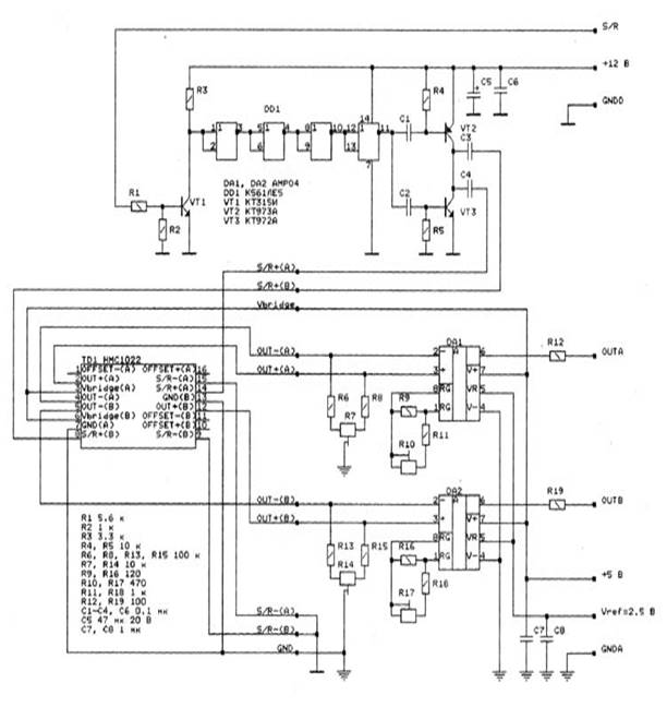 Для усиления выходного сигнала с датчиков производителем рекомендовано использовать аналоговые усилители на микросхемах AMP04 (DA1-DA4).