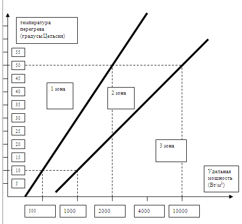 4) По диаграмме Рис. 1 находим точку, характеризующую тепловой режим работы модуля и определяем зону, в которую она попала.