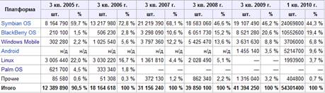 Статистика продукции смартфонов по доле операционных систем.