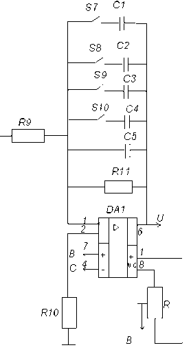 Резистор R10 вводится в ОУ с целью уменьшения погрешности от входных токов операционного усилителя. Полная коррекция погрешностей от этих токов достигается при равенстве сопротивления резистора R10 сопротивлению параллельно включенных резисторов R11 и R9 :