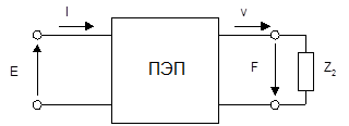 Для анализа переходных процессов в ПЭП применяют различные методы : метод дифференциальных уравнений, четырехполюсника , электрических моделей. Эти методы достаточно подробно изложены в [1] и [2]. В методе четырехполюсника связывают входное воздействие и выходную реакцию ПЭП. Ими могут быть различные физические величины. Например, в режиме излучателя входными величинами будут напряжение Е и ток I, а выходными – сила F и колебательная скорость v ( рис.2).