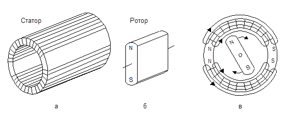 Основными частями электродвигателя являются статор и ротор (рис. 5, а, б) Статор собирается из тонких пермаллоевых колец. Обмотка статора состоит из двух секций, которые включаются встречно. Ротор представляет собой постоянный магнит из феррита. При пропускании тока через обмотки статора они создают в сердечнике магнитные потоки, направленные в разные стороны, поэтому основной поток в сердечнике равен нулю. Но ввиду того, что ширина колец мала по сравнению с их диаметром, образуются потоки рассеяния, сцепленные с обмотками. Получаются как бы два магнита с одинаково расположенными одноименными полюсами. Взаимодействуя с полями этих магнитов, ротор поворачивается, стремясь занять положение, параллельное обмоткам. Динамические характеристики механической системы и параметры тока возбуждения (величина, форма, период) согласованы так, что когда ротор повернется на угол 90 – 100о от исходного крайнего положения, происходит коммутация тока в обмотках и начинается его движение в обратную сторону.