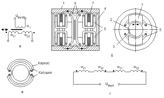На рис 7, б изображена упрощенная конструкция ДУП. Его основными частями являются статор 1 из мягкой стали, ротор 2 из немагнитной стали (например, 36НХТЮ) с помещенной на нем пластинкой 3 из ферромагнетика, каркас 4 с размещенными на нем парами сигнальных катушек 5 и катушкой возбуждения 6. Сигнальные катушки расположены парами симметрично относительно центра и имеют сложную форму. Для лучшего представления о ней на рис 14, в показан фрагмент каркаса и одна пара катушек. Пары соединяются последовательно, так, чтобы одноименные катушки были включены согласно (рис.7, г). Катушка возбуждения находится между парами сигнальных катушек. При монтаже края ее витков разводят («распушают»). Внутри сигнальных катушек закрепляют ферритовые сердечники 7.