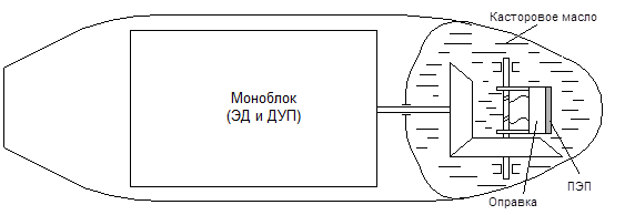 Дисковый пьезопреобразователь находится в оправке, которая закреплена на оси шестеренки. Для подвода импульса возбуждения и съема эхо-сигнала используются гибкие проводники, которые навиваются на ось. Это исключает их болтание во время качания ПЭП и продлевает срок службы. Электродвигатель и датчик углового положения конструктивно объединяются в моноблок, размещаемый в цилиндрическом корпусе из легкого металла.