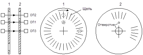 Более подробно устройство оптоэлектронного ДУП поясняет рис.10. Измерение углов производится с помощью ИК оптотоэлектронных пар ОП1, ОП2 и ОП3. Излучение источников проходит через щели и отверстия, расположенные на дисках. На диске 1 по периметру размещены щели (их может быть 128 – 256) и имеется одно отверстие. На диске 2 имеется две группы щелей по 8 –12 в каждой, разнесенные на угол около 90о . Для ИК излучения отверстие и щели диска 2 играют роль коллиматоров. Шаг щелей одной группы такой же, как и на диске 1, а шаг другой группы несколько иной. Одна из групп щелей (с меньшим шагом) выполняет роль нониуса и служит для более точного измерения углов. Метод нониуса широко используется в
