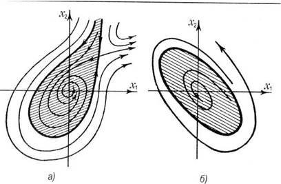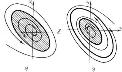 До тех пор, пока изображающая точка на фазовой плоскости рис. 2, а находится внутри заштрихованной области, с течением времени фазовые траектории системы будут стремиться к началу координат, и по отношению к таким начальным состояниям система является устойчивой. Если же в результате возмущения изображающая точка окажется вне заштрихованной области, то исходящая из этой точки фазовая траектория уходит в бесконечность, и по отношению к такому возмущению система неустойчива. Заштрихованную область притяжения особой точки, расположенной в начале координат, поэтому можно назвать областью устойчивости системы. Фазовый портрет, показанный на рис. 2, а, так же, как и фазовый портрет линейной системы, не содержит замкнутых фазовых траекторий. Между тем в нелинейных системах, как в том случае, когда имеется одна особая точка, так и в случае нескольких особых точек, могут содержаться замкнутые траектории.