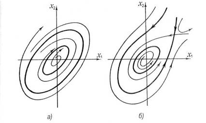 и уравнения имели только одно общее решение: х1 = х2 =0. В плоскости х1, х2 этм условия в случае линейной системы определяют две прямые линии, пересекающиеся в начале координат (рис.1, а). Если же функции f1 (х1 , x2 ) и f2 (х1 , х2 ) нелинейны, то кривые, соответствующие уравнениям, могут пересекаться и вне начала координат. Система имеет в этом случае, кроме решения х1 , =х2 = 0, и другие решения. В этом случае, кроме регулируемого режима, соответствующего началу координат, в системе возможны и иные положения равновесия (рис.1, б), и характер движения в системе зависит от величины отклонения от начала координат, вызванного возмущением.