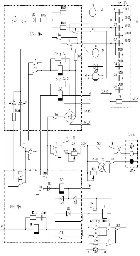 Принципова схема дешифратора АБ зображена на рисунку 2.3 відображає роботу дешифратора 6ДА блок-дільниці 6П для заданої ситуації згідно завдання курсового проекту. Блок-дільниця 6П вільна й до неї по рейковому колі з блок-дільниці 4П поступає код ЧЖ. Дешифратор 6ДА приймає ці імпульси та від імпульсу першого кодового циклу ЧЖ фронтовим контактом реле І одночасно замикаються три кола дешифратора.