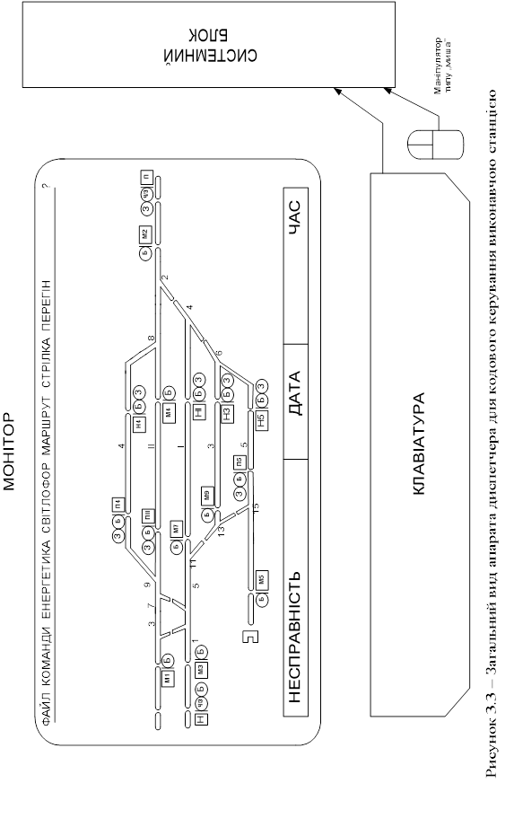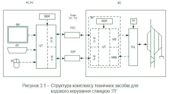 Комплекс технічних засобів для кодового керування станцією «П» (рисунок 3.1) складається із апаратури електричної централізації ЕЦ з пультом-табло ПТ для місцевого керування станцією і технічних засобів мікропроцесорної системи телекерування (системою МСКК). Система МСКК для даного випадку повинна складатися із двох комп'ютерів, що працюють під керуванням спеціального базового і прикладного програмного забезпечення й з'єднаних каналами зв'язку, основним та резервним. Один з комп'ютерів перебуває на розпорядницькій станції (станція Р), другий перебуває на виконавчій станції (станція П). За допомогою розпорядницького комп'ютера оперативний персонал розпорядницької станції здійснює керування виконавчою станцією й контролює стан її об`єктів: колій, стрілок та світлофорів.