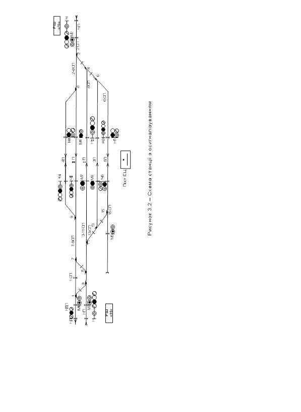 У процесі проектування електричної централізації (ЕЦ) насамперед розробляється однонитковий план станції, на якому розміщуються поїзні (вхідні, вихідні) і маневрові світлофори; визначається конструкція світлофорів (щоглові, карликові); нумеруються стрілки й сигнали; вказуються сигнальні вогні світлофорів; виконується розбивка колії на ізольовані ділянки (рис. 3.2).
