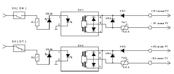 При надходженні команди телекерування програмно керований електроний ключ ЕК (ОФ) замикає коло керування опто-транзистром DA1. Світлодіод VD49 і світлодіод оптотранзистора загоряються. Оптотранзистор під впливом світлового потоку свого світлодіода відчиняється і замикає, в якому потече струм, який буде достатнім для спрацювання реле електричної централізації. Стабілітрон VD2 забезпечує захист від перенапруги, а запобіжник багаторазової дії FU1- від струмів короткого замикання.
