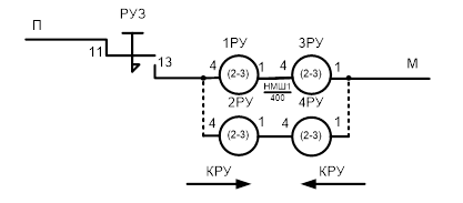 Ув'язування по кодовому керуванню станцією «П» виконується з допомогою модулів виведення. МВ підключаються до схем ЕЦ через тилові контакти реле резервного керування (РУ). Для переходу з кодового на резервне керування необхідно натисканням кнопки РК, що пломбується, збудити реле 1РУ - 4РУ (рис. 3.6). Фронтові контакти останніх підключають схеми ЕЦ до органів керування місцевого пульта-табло.