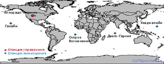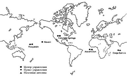 Наземный сегмент системы GPS состоит из 5-и контрольных станций и главной станции управления, расположенных на военных базах США – на островах Кваджалейн и Гавайях в Тихом океане, на острове Вознесенья, на острове Диего-Гарсия в Индийском океане и в Колорадо-Спрингс, они преведены на рисунке 1 .В задачи станций мониторинга входит прием и измерение навигационных сигналов поступающих с GPS спутников, вычисление различного рода ошибок и передача этих данных на станцию управления. Совместная обработка полученных данных позволяет вычислить отклонение траекторий спутников от заданных орбит, временные сдвиги бортовых часов и ошибки в навигационных сообщениях. Мониторинг состояния GPS спутников происходит практически непрерывно. «Загрузка» навигационных данных, состоящих из прогнозируемых орбит и поправок часов для каждого из спутников, осуществляется каждые 24 часа, в момент, когда он находится в зоне доступа станции управления.