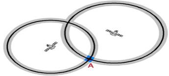 Высота орбит спутников составляет порядок 20000 км. Следовательно, вторую точку пересечения окружностей можно отбросить из-за априорных сведений, так как она находится далеко в космосе.