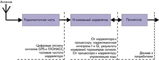 В корреляторе спектр сигнала переносится на «нулевую» частоту. Это производится путём перемножения входного сигнала коррелятора с опорным гармоническим колебанием в синфазном и квадратурном каналах. Далее результат перемножения проходит корреляционную обработку путём перемножения с опорным дальномерным кодом и накоплением на периоде дальномерного кода. В итоге получаем корреляционные интегралы I и Q. Отсчёты корреляционных интегралов поступают в процессор для дальнейшей обработки и замыкания петель ФАП (фазовая автоподстройка) и ССЗ (схема слежения за задержкой). Измерения параметров сигнала в приёмнике производятся не непосредственно по входному сигналу, а по его точной копии, формируемой системами ФАП и ССЗ. Корреляционные интегралы I и Q позволяют оценить степень «похожести» (коррелированности) опорного и входного сигналов. Задача коррелятора, помимо формирования интегралов I и Q, – формировать опорный сигнал, согласно с управляющими воздействиями (кодами управления), поступающими с процессора. Кроме того, в некоторых приёмниках коррелятор формирует необходимые измерения опорных сигналов и передаёт их в процессор для дальнейшей обработки. В то же время, так как опорные сигналы в корреляторе формируются по управляющим кодам, поступающим с процессора, то необходимые измерения опорных сигналов можно производить непосредственно в процессоре, обрабатывая соответствующим образом управляющие коды, что и делается во многих современных приёмниках.