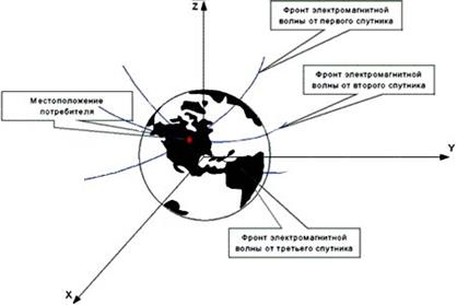 Каждый спутник можно представить в виде точечного излучателя. В этом случае фронт электромагнитной волны будет сферическим. Точкой пересечения двух сфер будет та, в которой находится потребитель.