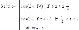 Одиночный прямоугольный импульс, в середине которого фаза скачком меняется на 180º можно описать выражением: