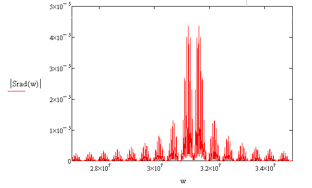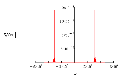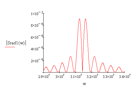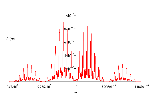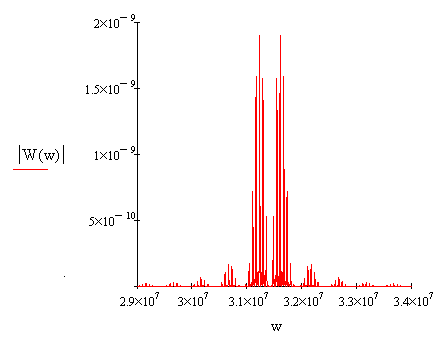 Спектральная плотность радиоимпульса представлена на рис.8. На рис.9 представлен увеличенный фрагмент в области положительных частот.