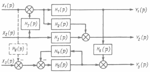 Например (рис. 3.1), для компенсации влияния y на y3 представ ленного в виде естественной связи с передаточной функцией Н6 (р), необходимо на вход х6 подать с входа Х корректирующую связь с передаточной функцией