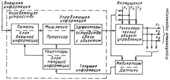 Объективные закономерности, присущие процессам переработки информации, обусловливают аналогию функциональных структур человека-оператора и управляющего устройства любого типа. Эта аналогия распространяется не только на перечень этапов переработки информации, но и на их содержание. Чтобы управлять технологическим объектом, управляющее устройство должно располагать информацией о его свойствах и состоянии в данный момент времени. Эти данные обеспечиваются введением в управляющее устройство априорной и текущей информации, объем которой зависит от сложности объекта и задач, им выполняемых. Любой объект рассматривается как система с входа ми и выходами. В том числе технологический объект можно представить как систему, входными исполнительными устройствами которой являются различного рода исполнительные приводы с передаточными устройствами, а выходными - параметры технологического процесса. В этом случае управляющее устройство должно вырабатывать воздействия на входы технологического объекта, так чтобы выходные технологические параметры для обеспечения требуемого качества выпускаемой продукции принимали заданное или оптимальное значение и не превышали допустимых значений. Это значит, что управляющие воздействия и их последовательность должны формироваться управляющим устройством с учетом особенностей технологического объекта, его состояния и тем самым обеспечивать необходимое целенаправленноe протекание технологического процесса. Следовательно, для высококачественного управления технологическим объектом необходимо знать связи (закономерности), существующие между его входными и выходными управляемыми величинами. Такие связи между выходами и входами объекта, представленные формализовано, носят название модели или алгоритма функционирования объекта. Без такой формальной модели объекта невозможна разработка целенаправленного управления им. Чем универсальнее, точнее модель технологического объекта, тем эффективнее и результативнее можно осуществить управление.
