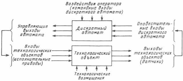 При управлении технологическим циклом необходимо формировать дискретную последовательность (программу) команд исполнительным элементам технологического объекта управления (электро- и гидроприводам). Формирование команд осуществляется управляющим устройством, называемым дискретным автоматом (рис. 3.6), на основе логического анализа ситуации, о которой сообщают различные датчики положения детали, завершения или качества протекания очередной технологической операции, по командным и оповестительным входам. Только зная, как и при каких условиях должна формироваться нужная последовательность состояния объекта управления, можно сформулировать задание на синтез управляющего устройства.