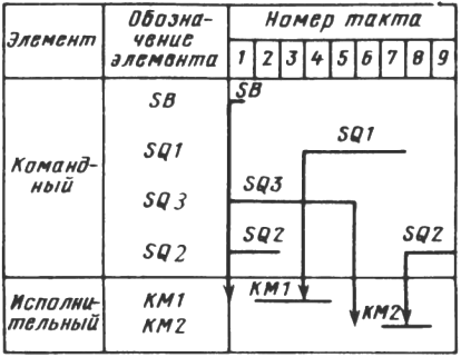 Циклограмма. Она представляет собой ряд горизонтальных строк, равных числу командных и исполнительных элементов. Строки условно разбиты на отрезки, число которых равно числу элементарных технологических тактов. Включенное состояние элемента на строке обозначается сплошной линией, отключенное — отсутствием ее. Вертикальными линиями на циклограммах показана "передача управления" - причинно-следственные связи между командными и исполнительны ми элементами.