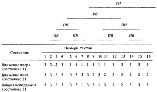 В первой строке исходным является состояние 1 (движение вверх), поэтому во всех клетках, соответствующих действию РВ, проставляется 1. При отсутствии разрешения на движение вверх (отсутствует PВ) кабина не движется, в этих клетках ставится 3. Аналогично заполняется вторая строка, т.е. где есть РН — ставится 2, а в остальных — 3.
