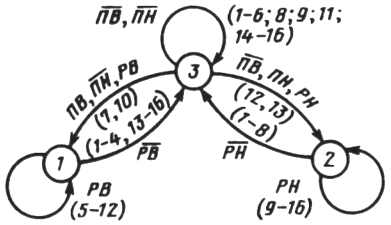 На рис. 3.9 представлен граф, описывающий работу подъемника из примера 3.8. Граф имеет три вершины (состояния 1, 2, 3) (см. табл. 3.15). Пуск из состояния 3 (подъемник неподвижен) в состояние 1 или 2 (движение вверх или вниз) обусловлен наличием требуемой команды (ПВ или ПН), отсутствием противоположной (ПН или ПВ) и наличием разрешений (РВ или РН). Обратный переход обусловлен только отсутствием разрешения (РВ или РН), т.е. снятие ПВ или ПН останова не вызывает. Сохранение состояния 1 или 2 обусловлено только наличием РВ или РН, а состояние 3—их отсутствием. В скобках над или под стрелками указаны номера комбинаций переменных (такты), соответствующие данному переходу.