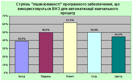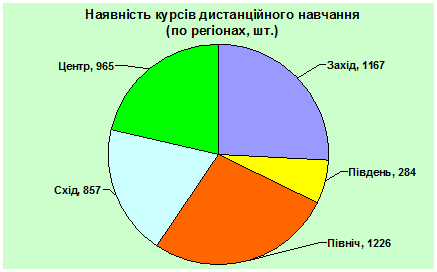 На діаграмі 1 подано розподіл по регіонах дистанційних курсів ВНЗ власної розробки. З досвіду відомо, що більшість з них є продуктами, які технологічно не сумісні з іншими курсами, що розроблені в інших платформах. Зазвичай, розробниками курсів були викладачі, які розробляли їх на власний розсуд під особисті потреби, по мірі освоєння ними тих чи інших програмних інструментів, що використовувалися для розроблення, і набування певного професійного досвіду. В силу цього, майже усі розроблені курси відносяться до предметів економічної та гуманітарної сфери, оскільки реалізація таких курсів потребує меншої професійної підготовленості, часу і, відповідно, коштів. Мало того – багато з них дублюють один одного і дуже відрізняються за якістю реалізації, оскільки їх розроблення не координувалося ні на державному, ні на міжуніверситетському рівнях.