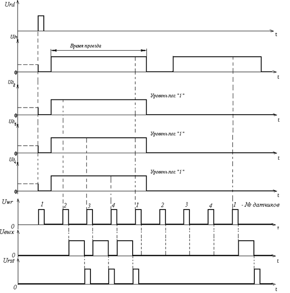 Рассмотрим наихудший случай для проектируемой системы: пусть по четырем полосам через датчики одновременно проехали автомобили. Тогда коммутатор будет распределять импульсы следующим образом: на счетчик поступают тактирующие импульсы Uwr, формируется код номера датчика, линию которого надо опросить. Этот код поступает на мультиплексор, который осуществляет подключение соответствующего датчика к микропроцессору. На выходе коммутатора будут информационные импульсы Uвых. При единичном состоянии датчика триггер сбрасывается в "0" импульсом Urst для предотвращения повторного учета "старой" информации.
