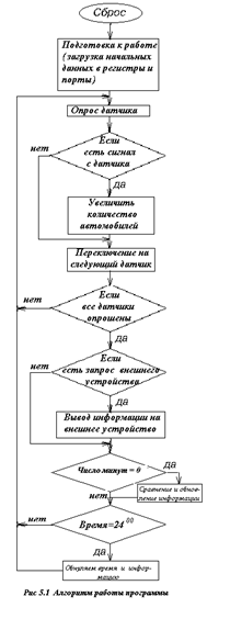 Программно реализуется счетчик внешних событий на регистрах R4 и R6, а таймер реального времени на таймере-счетчике Т/С1. Импульс, приходящий с коммутатора вызывает увеличение содержимого счетчика, причем информация о максимальном значении автомобилей и час-пике обновляется каждый час. Время берется из таймера реального времени.
