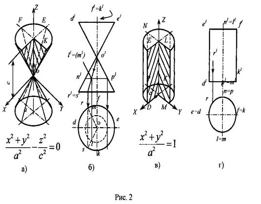 1. Конус образуют вращением прямой СЮ вокруг пересекающейся с ней оси Z(рис. 2, а). Координатные пл. ХО Z и У0Z рассекают конус по пресекающимся прямым ОD, ОЕ, ОК и OF; пл. ХОYдает в сечении точку О; плоскость, параллельная пл. ХОY, пересекает по окружности (DFЕК).