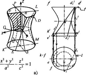 3. Однополостной гиперболоид образуют вращением прямой DЕ вокруг скрещивающейся с ней оси Z (рис. 3, а). Пл. ХОZ и YОZ пересекают его по гиперболам FК, LМ, РQ и RS, а пл. ХОY и ей параллельные - по окружностям (GU, FРLР и КQМS). При вращении точек D и Е их проекции d и е перемещаются по окружности, и проекции d' и е' - по прямым, параллельным оси X. Точка U прямой DЕ, ближе других расположенная к оси вращения, описывает окружность UU1 наименьшего диаметра. Эту окружность называют гордом поверхности. Лучи, проектирующие какую-либо поверхность, касаются ее в точках, образующих контурную линию. Соответствующая проекция этой линии называется очерком поверхности. Очерком однополостногогиперболоида на пл. V служат две ветви гиперболы, вершины которой лежат на горле поверхности. Следовательно, эту поверхность можно образовать вращением гиперболы вокруг ее мнимой оси.