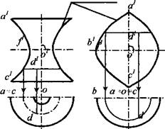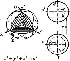 1. Сферу образуют вращением окружности вокруг ее диаметра (рис. 3, б). Любая плоскость пересекает сферу по окружности. Очерк фронтальной проекции сферы называют главным меридианом, очерк горизонтальной проекции -экватором. Проекции точки К, лежащей на поверхности сферы, принадлежат проекциям горизонтальной окружности, проведенной на сфере.