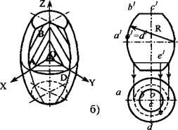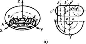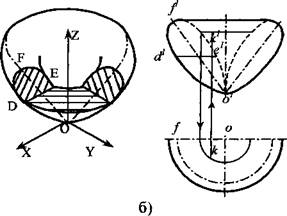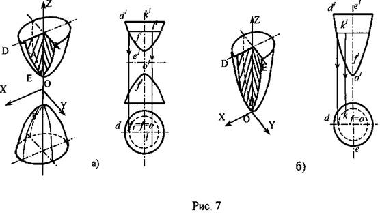 5. Параболоид образуют вращением параболы ОD вокруг ее фокальной оси ОF (рис. 7, б). Пл. ХО Z . и YОZ пересекают эту поверхность по параболам ОD и ОЕ, а пл. ХОY дает в сечении точку О.