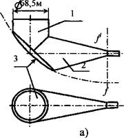 параболическими. Нередко зеркало антенны является сочетанием нескольких поверхностей. Так, антенна, предназначенная для дальней космической связи (рис.7, а), состоит из цилиндрического раскрыва 1, конического рупора 2 и параболического отражателя радиоволн 3. Фокус параболоида находится в точке Р.